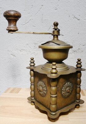 Die Mühle mit Kegelmahlwerk wurde aus Messing gefertigt. Lediglich das "Innenleben" der Schublade und die Griffe von Schublade und Kurbel sind aus Holz. Der Trichter zum Einfüllen der Bohnen ist oben auf dem Körper angebracht. Der Corpus ist quadratisch. An den vier Ecken sind Beluster-Ecken (Rundsäulen, die die Stabilität des Mühlenkörpers gewährleisten) angebracht. Unter diesen sind Standfüßchen. Alle vier Seiten sind mit Rosetten/Blüten dekoriert. Bei der Frontseite befindet sich die Rosette auf der Schublade. Die Bohnen werden oben in den Schiebedeckeltrichter (Bohnentrichter) eingefüllt. Die Mühle besitzt ein oberstelliges (d.h. der Mahlgrad wird wird von oben geregelt) Kegelmahlwerk. Unter dem Mahlwerk befindet sich eine mit Kupfer verblendete hölzerne Schublade mit einem Holzgriff. In diese fällt das Kaffeepulver nach dem Mahlvorgang. Das Mahlwerk wird mit einer Kurbel händisch angetrieben. Die Kurbel besitzt einen geschwungenen vielfach durchbrochenen Stiel und einen dunkelbraun lackierten Holzgriff. Diese Mühle wurde in sehr großer Stückzahl hergestellt und ist in nahezu allen Kaffeemühlensammlungen vorhanden (Schloss Blankenheim, https://www.old-coffee-grinders.com , Kaffeemühlenmuseum Wiernsheim, ... ). Auf der Mühle befinden sich keine Informationen zum Hersteller und zum Herstellungsjahr. Der vermutete Herstellungsort und Herstellungszeitraum variieren je nach Quelle. Ersterer meist Osteuropa, aber auch Frankreich, letzterer liegt im Bereich 1850-1920.