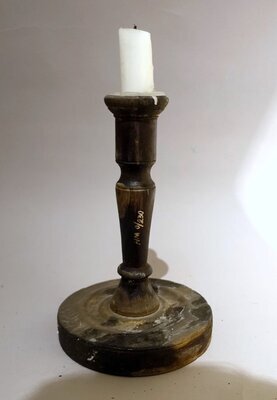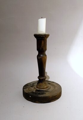 Ein Kerzenleuchter über rundem Fuß, der mit zwei Profilringen geziert ist. Darüber erhebt sich der dreiteilige Schaft: mit kurzem, stark konisch verjüngtem unteren Teil, konisch verbreitertem mittleren Teil und dem zylindrischen, mit einem hohen Rand abgeschlossenem Kerzenhalter. Trennend zwischen unterem und mittlerem Teil ist ein Ring geschnitzt, zwischen mittlerem Teil und Kerzenfassung befindet sich ein eingezogener Hals.