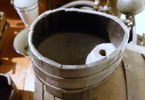 Längsovaler, sich nach oben zu verjüngender Fasstrichter aus Holz. Im Trichterboden ist: "Rich.Bing, Speyer a. Rh." eingeprägt. Der Fasstrichter wurde auf das Fass gesetzt, waagrecht abgestützt durch die beiden Beine (eines ist abgebrochen). Durch die Öffnung konnte der Wein wieder in das Fass gegossen werden.