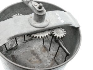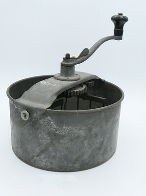 Rührgerät aus verzinktem Eisenblech. Mechanik aus verzinktem Gusseisen. Griff der Kurbel aus gedrechseltem Holz. Das Gerät besteht aus einer Blechschüssel und einer Mechanik zum Aufschlagen von Sahne. Mittels Kurbel und Übersetzung werden vier nach unten gerichtete Metallbügel in Bewegung gesetzt und schlagen die in die Schüssel gefüllte Sahne auf. Kein Hinweis auf Entstehungsjahr und Hersteller.