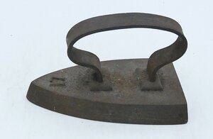 Spitz zulaufendes leicht rostiges Flachbügeleisen mit angeschweistem Eisenbügel im Rheinischen Stil, gerader und flacher Oberfläche. An der Spitze die Zahl "17" für die Größe des Eisens. Es handelt sich um ein einfaches Flacheisen, das auf der Herdplatte oder an einem Bügeleisenofen erhitzt werden musste. Das leichte Flachbügeleisen gehört zu den massiven Volleisen, die aus Eisen oder Stahlgeschmiedet oder gegossen und bereits ab dem 18. Jh. hergestellt wurden. Auf Grund seines geringen Gewichts und seiner flachen Sohle, die nahezu mühelos über die vorher mit Wasser besprengte Wäsche gleitet, erfreute es sich noch weit bis ins 20. Jahrhundert hinein großer Beliebtheit. Das Erhitzen auf dem Kohleofen oder in einer offenen Feuerstelle wie dem Kaminfeuer erforderte jedoch verschiedene Vorsichtsmaßnahmen, um die Bügelwäsche nicht zu beschmutzen oder sich am fest verbundenen Metallgriff zu verbrennen. Viele Büglerinnen wischten daher nach dem Erhitzen des Eisens mit einem Tuch, das sie an ihrer Schürze befestigt hatten, über die Bügelsohle. Als Hitzeschutz wurde oftmals ein dicker Handschuh oder ein Lappen, der um den Griff gewickelt wurde, verwendet.