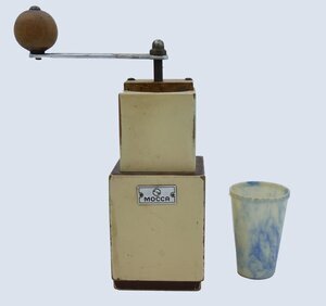 KyM Turmmühle Nr. 900 aus elfenbeinfarbig lackiertem Hartholz. An der Vorderseite befindet sich das Firmenschild mit der Aufschrift KyM MOCCA Von der Konstruktion der Mokka-Mühle her ist der vordere Teil des Deckels abnehmbar um dort die Bohnen hineinzuschütten. Der abnehmbare Teil des Deckels ist leider abgängig. Die Mühle besitzt ein unterstelliges Mocca-Mahlwerk (mit feinen Rillen am Mahlkegel und Mahlkranz). Die Kurbel ist vernickelt und besitzt einen kugelförmigen Holzgriff. Eine Besonderheit dieser Mühle ist, dass der gemahlene Kaffe nicht in eine Schublade fällt, sondern in ein von unten in die Mühle einschiebbares, trichterfömiges Gefäß aus Bakelit, das nach dem Mahlvorgang zusammen mit dem Kaffeepulver herausgenommen werden kann. Hersteller war die Firma Kissing & Möllmann in Iserlohn, die von 1826 bis 1980 existierte, neben anderen Produkten auch Kaffeemühlen herstellte und vor dem Ersten Weltkrieg hierbei Marktführer war.