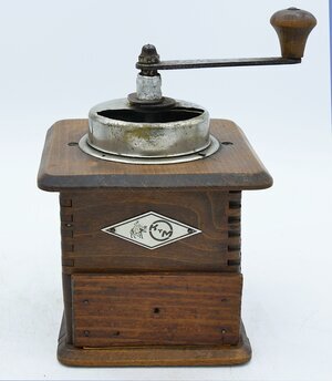 Die Mühle mit Kegelmahlwerk wurde aus dunkel gebeiztem Holz gefertigt. Auf der Frontseite der Mühle befindet sich ein Typenschild. Auf diesem ist links ein Kamel mit Reiter und rechts das Firmenlogo mit dem Schriftzug KyM abgebildet. Die Kaffeebohnen und/oder der Kaffeeersatz werden bei dieser Mühle oben in die Kuppel eingefüllt und fallen in einen Blechtrichter. Die Mühle besitzt ein oberstelliges Kegelmahlwerk. Die Mühle wurde zur Verstellung des Mahlgrads mit dem "patentierten Feinsteller" mittels Mutterhülse verkauft. Unter dem Mahlwerk befindet sich eine hölzerne Schublade in die das Kaffeepulver nach dem Mahlvorgang fällt. Der Knauf der Schublade ist leider verloren gegangen. Bedient wird das händisch angetriebene Mahlwerk mit einer Kurbel, die sich oberhalb der Kuppel befindet. Die Kurbel besitzt einen flachen Stiel und einen Holzgriff. Auf dem Stiel befindet sich eine Punze mit dem Firmenlogo. Hersteller ist die Firma Kissing & Möllmann in Iserlohn, die von 1826 bis 1980 existierte, neben anderen Prodkuten auch Kaffeemühlen herstellte und vor dem Ersten Weltkrieg hierbei Marktführer war.