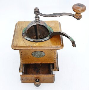 Kaffeemühle der Firma Zassenhaus. Die Kaffemühle dient dazu Kaffebohnen zu zerkleinern. Die Bohnen werden oben im Glocken-Doppelschiebedeckel in eine durch einen Schiebeverschluss öffenbare Öffnung in der Kuppel in die Mühle geschüttet und durch Drehen der Kurbel im Mahlwerk gequetscht und zerkleinert. Sie fallen aus dem Mahlwerk in die darunterliegende Schublade mit weißem Griff und können dort entnommen werden. Die Mühle aus Buchenholz mit gezapftem Mühlenkörper besitzt ein unterstelliges (d.h. der Mahlgrat wird unterhab des Mahlwerks eingestellt) Mahlwerk. Auf der Frontseite der Mühle überhalb der Schublade befinden sich auf einem stark erodiertem Blechschild Logo und Schriftzug des Herstellers: ZASSENHAUS R. Z. QUALITÄTSAWARE zwischen R. und Z. befindet sich das Logo der Firma: Der Löwe mit dem Sonnenschirm. Die Mühle ist unrestauriert und zeigt starke Gebrauchsspuren.