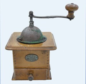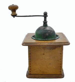 Kaffeemühle der Firma Zassenhaus. Die Kaffemühle dient dazu Kaffebohnen zu zerkleinern. Die Bohnen werden oben im Glocken-Doppelschiebedeckel in eine durch einen Schiebeverschluss öffenbare Öffnung in der Kuppel in die Mühle geschüttet und durch Drehen der Kurbel im Mahlwerk gequetscht und zerkleinert. Sie fallen aus dem Mahlwerk in die darunterliegende Schublade mit weißem Griff und können dort entnommen werden. Die Mühle aus Buchenholz mit gezapftem Mühlenkörper besitzt ein unterstelliges (d.h. der Mahlgrat wird unterhab des Mahlwerks eingestellt) Mahlwerk. Auf der Frontseite der Mühle überhalb der Schublade befinden sich auf einem stark erodiertem Blechschild Logo und Schriftzug des Herstellers: ZASSENHAUS R. Z. QUALITÄTSAWARE zwischen R. und Z. befindet sich das Logo der Firma: Der Löwe mit dem Sonnenschirm. Die Mühle ist unrestauriert und zeigt starke Gebrauchsspuren.