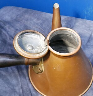 Kaffeekanne aus Kupfer, innen verzinnt. Der große Griff ist aus schwarz gebeiztem Holz, die Beschläge und der Knauf am Deckel sind aus Messing. Da es sich um eine relativ kleine Kanne handelt, liegt es nahe, dass sie für Wasser zum Aufgießen von Mokka in der Tasse verwendet wurde. In anderen Quellen wird dieses Modell auch als Kanne für Trinkschokolade bezeichnet.
