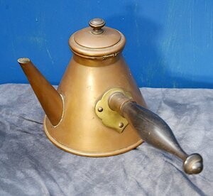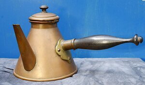Kaffeekanne aus Kupfer, innen verzinnt. Der große Griff ist aus schwarz gebeiztem Holz, die Beschläge und der Knauf am Deckel sind aus Messing. Da es sich um eine relativ kleine Kanne handelt, liegt es nahe, dass sie für Wasser zum Aufgießen von Mokka in der Tasse verwendet wurde. In anderen Quellen wird dieses Modell auch als Kanne für Trinkschokolade bezeichnet.