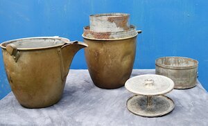 Russische Kaffeemaschine, wird auch als Russisches Ei, Neapolitanische Kaffeemaschine oder Potsdam Boiler bezeichnet. Sie ist eine Filterkaffeemaschine mit Siebträgern. Die Kaffeemaschine besteht aus innen verzinntem Kupfer. Die Siebe im inneren sind aus verzinntem Eisenblech. Die Kaffeemaschine ist nicht vollständig. Es fehlt das Gestänge mit Spiritusbrenner, in das sie eingehängt werden kann (siehe letzte Abbildung mit zwei Vergleichsobjekten). Dies geschieht an dem Rohr zwischen Griff und der Maschine und einem keinen Rohrstumpf auf der Gegenseite. Möglicherweise hat dieses Exemplar aber nie ein Gestänge besessen, da sie auch ohne dieses funktioniert. In diesem Fall muss man die Maschine wie eine Kippkanne auf eine externe Brenner oder eine Gasflamme stellen. Die Kaffeemaschine funktioniert etwa wie folgt: Man schraubt den Griff ab und trennt durch eine leichte Drehung die beiden Teile der Kaffeemaschine. Der auf dem Foto obere Teil enthält im Inneren den Siebträger. Man nimmt diesen heraus, füllt ihn mit Kaffeepulver und den Kaffeemaschinenteil darunter bis maximal auf die Höhe des Siebträgers mit Wasser. Dann stülpt man den anderen Teil der Kaffeemaschine (der Teil mit dem Schnabel) auf diesen, macht ihn fest und schraubt den Griff wieder an. Die Kaffeemaschine steht jetzt auf dem in der Abbildung oberen Teil. Jetzt schraubt man den Griff wieder an und hängt die Kaffeemaschine in das Gestell. Unten am Gestell befindet sich ein Spiritusbrenner mit dem man das Wasser erhitzen kann. Wenn das Wasser kocht dreht man die Maschine mit dem Griff 1/2 mal vertikal um die eigenen Achse. Jetzt steht sie wieder so wie auf dem Foto und das heiße Wasser läuft durch den Siebträger und das darin befindliche Kaffeepulver. Im unteren Teil sammelt sich der Kaffee. Dieser kann dann durch den Schnabel in die Kaffeetasse abgegossen werden. Kein Hinweis auf Hersteller und Herstellungsjahr.