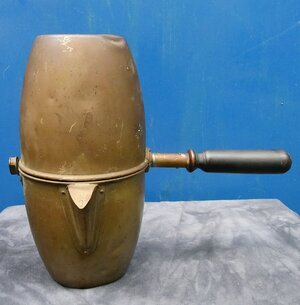 Russische Kaffeemaschine, wird auch als Russisches Ei, Neapolitanische Kaffeemaschine oder Potsdam Boiler bezeichnet. Sie ist eine Filterkaffeemaschine mit Siebträgern. Die Kaffeemaschine besteht aus innen verzinntem Kupfer. Die Siebe im inneren sind aus verzinntem Eisenblech. Die Kaffeemaschine ist nicht vollständig. Es fehlt das Gestänge mit Spiritusbrenner, in das sie eingehängt werden kann (siehe letzte Abbildung mit zwei Vergleichsobjekten). Dies geschieht an dem Rohr zwischen Griff und der Maschine und einem keinen Rohrstumpf auf der Gegenseite. Möglicherweise hat dieses Exemplar aber nie ein Gestänge besessen, da sie auch ohne dieses funktioniert. In diesem Fall muss man die Maschine wie eine Kippkanne auf eine externe Brenner oder eine Gasflamme stellen. Die Kaffeemaschine funktioniert etwa wie folgt: Man schraubt den Griff ab und trennt durch eine leichte Drehung die beiden Teile der Kaffeemaschine. Der auf dem Foto obere Teil enthält im Inneren den Siebträger. Man nimmt diesen heraus, füllt ihn mit Kaffeepulver und den Kaffeemaschinenteil darunter bis maximal auf die Höhe des Siebträgers mit Wasser. Dann stülpt man den anderen Teil der Kaffeemaschine (der Teil mit dem Schnabel) auf diesen, macht ihn fest und schraubt den Griff wieder an. Die Kaffeemaschine steht jetzt auf dem in der Abbildung oberen Teil. Jetzt schraubt man den Griff wieder an und hängt die Kaffeemaschine in das Gestell. Unten am Gestell befindet sich ein Spiritusbrenner mit dem man das Wasser erhitzen kann. Wenn das Wasser kocht dreht man die Maschine mit dem Griff 1/2 mal vertikal um die eigenen Achse. Jetzt steht sie wieder so wie auf dem Foto und das heiße Wasser läuft durch den Siebträger und das darin befindliche Kaffeepulver. Im unteren Teil sammelt sich der Kaffee. Dieser kann dann durch den Schnabel in die Kaffeetasse abgegossen werden. Kein Hinweis auf Hersteller und Herstellungsjahr.