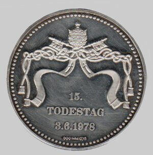 Johannes XXIII. war Papst der kath. Kirche von 1958-1963 Die Medaille aus 999 Silber wurde 1978 geprägt und ist unsigniert. Sie wurde zum 15. Todestag herausgegeben und mit der Punze 999 IMM 1978 versehen. Auf der Vorderseite ist der Papst im Ornat von vorne abgebildet. Auf der Rückseite ist die Papstkrone (Tiara) mit zwei Schlüsseln, zwei mit Trotteln am Ende versehene Schnüre und eine Langstola abgebildet.