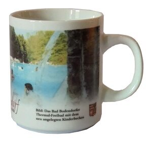 Zur Erinnerung an 1111 Jahre von Bad Bodendorf wurden im Jahr 2004, in limitierter Auflage, Tassen mit Motiven von Bad Bodendorf herausgegeben. Finanziert wurde die Aktion durch Sponsoring von Unternehmen im Ort durch die Dorfgemeinschaft aufgelegt. Diese Tasse, die dritte in der Serie von fünf Tassen, zeigt das Thermalfreibaden von Bad Bodendorf. Das Bild und die Schrift sind mit einem Abziehbild aufgebracht und eingebrannt.