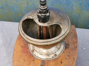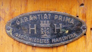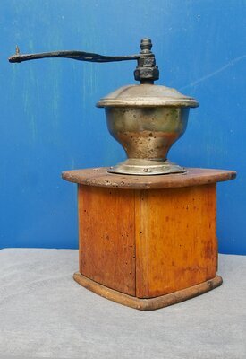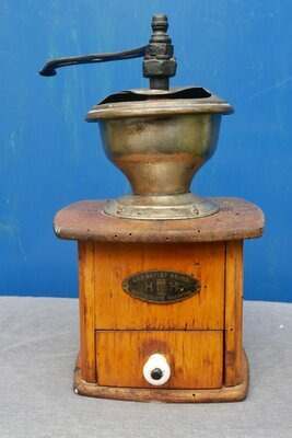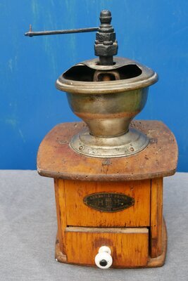 Kaffeemühle H H - Die Kaffeemühle dient dazu Kaffeebohnen zu zerkleinern. Die Mühle der Firma Harhaus ist aus lackiertem Holz mit einigen Metallteilen gefertigt. Der Trichter zum Einfüllen der Bohnen ist oben auf dem Körper angebracht. Die Bohnen werden oben in den Schiebedeckeltrichter (Bohnentrichter) eingefüllt. Der Schieber ist abgängig. Der Corpus ist quadratisch. Obere und untere Deckplatte sind konkav geschwungen. Die Mühle besitzt ein oberstelliges Kegelmahlwerk bei dem der Mahlgrad mit einer Flügelschraube eingestellt wird. Die Kurbel besitzt einen geschwungenen, dreifach durchbrochenen Stiel. Ihr Griff ist abgängig. Der gemahlene Kaffee wird in einer Schublade unterhalb des Mahlwerks aufgefangen. Auf der Frontseite befindet sich die Plakette "GARANTIRT PRIMA" (kein Tippfehler) darunter "H H" darunter "GESCHMIEDETES MAHLWERK" Zwischen den beiden H befindet sich das Firmenwappen: Ein Bäumchen mit 3 Türmen darüber. Die Kaffeemühle wurde vor 1910 hergestellt, da die Firma in diesem Jahr ihr Logo von H H nach HaHa änderte.