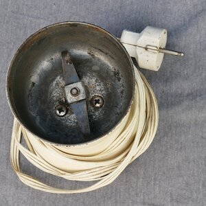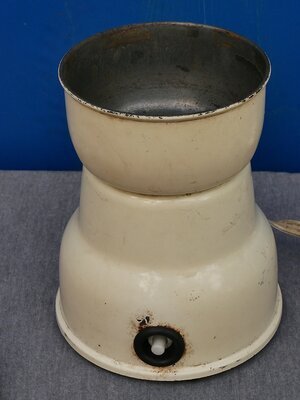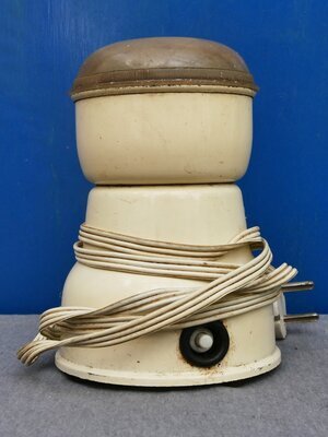 Kaffeemühle für Privathaushalte der Firma Moulinex. Die Kaffeemühle diente dazu Kaffeebohnen zu zerkleinern. Die Mühle ist eine Schlagmühle und wird elektrisch angetrieben. Schlagmühlen (Propellermühlen) besitzen ein sich schnell drehendes Schlag-Messer. Die Mühle besitzt einen durchsichtigen Kunststoffdeckel und einen Druckknopf. Nur wenn letzterer gedrückt ist, wird das Mahlwerk in Betrieb gesetzt. Das dreipolige flache Anschlusskabel und der Schuko-Stecker sind original. Zum Kaffeemahlen werden die Bohnen werden von oben in den mit einer durchsichtigen Kunststoffhaube verschließbaren Behälter für die Bohnen hineingeschüttet. Dann wird die Mühle durch Knopfdruck gestartet und die Bohnen in diesem Behälter zerkleinert. Mühlen dieser Bauart verdrängten ab den 1950er Jahren die handbetriebenen Kaffeemühlen. Der Nachteil von Schlagmühlen ist, dass die Korngröße des gemahlenen Kaffees nicht einheitlich ist und durch die (unfreiwillige) Erhitzung des Kaffees viel an Geschmack verloren geht. Ein anderes Exemplar dieser Mühle, das im September 2023 auf kleinanzeigen.de angeboten wurde, besitzt am Boden die Aufschrift PRODUCTION "MOULIN-LÉGUMES" Diese deutet darauf hin, dass diese Mühle (auch) zum Zerkleinern von (kleinem) Gemüse verwendet werden konnte. Betrachtet man die Rückstände in unserer Mühle, so deuten diese jedoch eindeutig darauf hin, dass in dieser Kaffeebohnen gemahlen wurden.