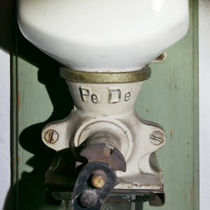 Kaffeemühle mit Wandhalterung aus weiß glasierter Keramik. Die Bohnen werden nach Abnahme des Holzdeckels in einen Keramikbehälter mit der blauen Aufschrift KAFFEE geschüttet. Unter diesem ist das unterstellige Kegelmahlwerk. Dreht man an der Kurbel, werden die über dem Mahlwerk gelagerten Bohnen gemahlen und das Kaffepulver wird in dem unter dem Mahlwerk befindlichen gläsernen Auffangbehälter aufgefangen. Auf dem Mahlwerk befindet sich die Aufschrift "Pe De" für Peter Dienes. Mit einem Stift unten am Mahlwerk kann die Feinheit eingestellt werden. Die Firma Peter Dienes (Pe De) entstand 1869 durch Übernahme der Firma "Wiebel Eisenkaffeemühlen" in Remscheid-Bliedinghausen und produzierte in Deutschland bis 1962 bzw. 1970 in Holland Kaffeemühlen.