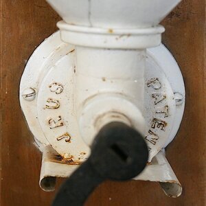 Kaffeemühle mit Wandhalterung aus weiß glasierter Keramik. Die Bohnen wurden nach Abnahme des Holzdeckels in einen Keramikbehälter geschüttet. Diese Mühle hat wie alle Mühlen der Firma JRUS kein Kegelmahlwerk sondern Schleifscheiben aus Kunstmahlsteinen. Dreht man an der Kurbel, werden die über dem Mahlwerk gelagerten Bohnen gemahlen und das Kaffeepulver wird in dem unter dem Mahlwerk befindlichen gläsernen Auffangbehälter aufgefangen. Auf dem Mahlwerk befindet sich eine künstlerisch gestaltete Oberfläche mit den Aufschriften "JRUS", "KAFFEE" und "D.R.P.a". Letzteres steht für Deutsches Reich Patent (siehe Link auf Patentschrift weiter unten). Auf dem Mahlwerk befindet sich als erhabenes Relief die Schrift "JRUS PATENT" Die Firma JRUS (ab 1950 IRUS) eigentlich "IRSUWERKE DUSSLINGEN J.RILLING & SÖHNE, Dusslingen" wurde 1865 gegründet und fertigte in ihrer Geschichte neben Kaffeemühlen unter anderem auch Wasserräder, Hackblöcke für Fleischereibetriebe und Stanzwerkzeuge für die Schuh- und Lederindustrie. Die Firma fertigte auch die Kaffeemühle für die Bordküche des Luftschiffs Graf Zeppelin. Sie wurde 1984 geschlossen.