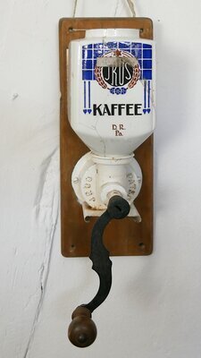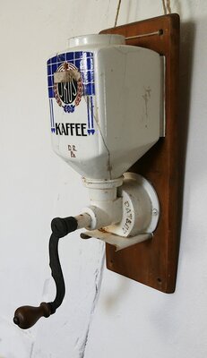 Kaffeemühle mit Wandhalterung aus weiß glasierter Keramik. Die Bohnen wurden nach Abnahme des Holzdeckels in einen Keramikbehälter geschüttet. Diese Mühle hat wie alle Mühlen der Firma JRUS kein Kegelmahlwerk sondern Schleifscheiben aus Kunstmahlsteinen. Dreht man an der Kurbel, werden die über dem Mahlwerk gelagerten Bohnen gemahlen und das Kaffeepulver wird in dem unter dem Mahlwerk befindlichen gläsernen Auffangbehälter aufgefangen. Auf dem Mahlwerk befindet sich eine künstlerisch gestaltete Oberfläche mit den Aufschriften "JRUS", "KAFFEE" und "D.R.P.a". Letzteres steht für Deutsches Reich Patent (siehe Link auf Patentschrift weiter unten). Auf dem Mahlwerk befindet sich als erhabenes Relief die Schrift "JRUS PATENT" Die Firma JRUS (ab 1950 IRUS) eigentlich "IRSUWERKE DUSSLINGEN J.RILLING & SÖHNE, Dusslingen" wurde 1865 gegründet und fertigte in ihrer Geschichte neben Kaffeemühlen unter anderem auch Wasserräder, Hackblöcke für Fleischereibetriebe und Stanzwerkzeuge für die Schuh- und Lederindustrie. Die Firma fertigte auch die Kaffeemühle für die Bordküche des Luftschiffs Graf Zeppelin. Sie wurde 1984 geschlossen.