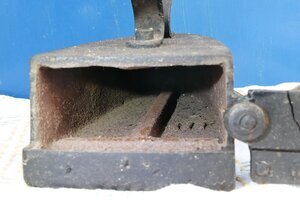Flachbolzenbügeleisen (Kastenbügeleisen, Reisebügeleisen) aus Gusseisen und Eisenblech mit schiffförmigem Rumpf. In den Rumpf kann ein erhitzter Bolzen von hinten eingeführt werden. Mit diesem wird der Boden des Bügeleisens erhitzt. Der Innenraum kann mit einer Klappe verschlossen werden, sodass der Eisenkeil nicht nach hinten herausfallen kann. Als Griff dient ein mit Leder umwickeltes Metallband. Im Inneren des Eisens befindet sich eine gerade Rippe die verhindert, dass der Eisenkeil direkt auf dem Boden aufliegt und der Boden des Eisens zu heiß für das Bügeln wird. Links von der Rippe befindet sich ein nicht mehr lesbarer Buchstabe, rechts befindeten sich 3 Striche, möglicherweise sind sie als 3 zu deuten. Das zugehörige Gitter dient zum Abstellen des (heissen) Bügeleisens.