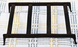 Flachbolzenbügeleisen (Kastenbügeleisen, Reisebügeleisen) aus Gusseisen und Eisenblech mit schiffförmigem Rumpf. In den Rumpf kann ein erhitzter Bolzen von hinten eingeführt werden. Mit diesem wird der Boden des Bügeleisens erhitzt. Der Innenraum kann mit einer Klappe verschlossen werden, sodass der Eisenkeil nicht nach hinten herausfallen kann. Als Griff dient ein mit Leder umwickeltes Metallband. Im Inneren des Eisens befindet sich eine gerade Rippe die verhindert, dass der Eisenkeil direkt auf dem Boden aufliegt und der Boden des Eisens zu heiß für das Bügeln wird. Links von der Rippe befindet sich ein nicht mehr lesbarer Buchstabe, rechts befindeten sich 3 Striche, möglicherweise sind sie als 3 zu deuten. Das zugehörige Gitter dient zum Abstellen des (heissen) Bügeleisens.