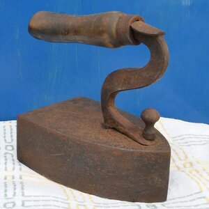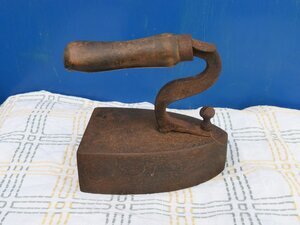 Flachbolzenbügeleisen (Kastenbügeleisen, Reisebügeleisen) aus Gusseisenm, Eisenblech und einem hölzernen Griff mit schiffförmigem Rumpf. In den Rumpf kann ein erhitzter Bolzen von hinten eingeführt werden. Mit diesem wird der Boden des Bügeleisens erhitzt. An der Rückseite befindet sich uten ein Steg, über den der Bolzen eingeführt werden kann und der verhindert, dass der Bolzen nach hinten herausfallen kann - es sei den das Bügeleisen wird zu temperamentvoll geschleudert. Der mit Holz isolierte Griff ist an einem zweifach gebogenen Stiel aus Eisen befestigt. Im Inneren des Eisens befinden sich zwei Rippen die verhindern, dass der Eisenkeil direkt auf dem Boden aufliegt und der Boden des Eisens zu heiß für das Bügeln wird. Der Bolzen ist leider nicht mehr vorhanden. Keine Informationen zum Hersteller.