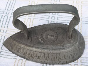 Flachbügeleisen mit angegossenem Eisenbügel im Rheinischen Stil und gerader und flacher Oberseite. Auf der Oberseite des Eisens befinden sich in einem Kranz mit oben und unten jeweils 3 Blättern die Zahl (Größenangabe) 7, darunterdie Initialen S D des Herstellers. Um die Oberseite des Eisens läuft am Rand ein niedriger Wulst. Der eiserne Bügel besteht aus einem an 2 Stellen auf dem Eisen angegossenem Eisenband. Die Seiten des Eisens sind rund herum mit einem Laufmuster verziert. Es handelt sich um ein einfaches Flacheisen, das auf der Herdplatte oder an einem Bügeleisenofen erhitzt werden musste. Das leichte Flachbügeleisen gehört zu den massiven Volleisen, die aus Eisen oder Stahlgeschmiedet oder gegossen und bereits ab dem 18. Jh. hergestellt wurden. Auf Grund seines im Vergleich zu Blockeisen relativ geringen Gewichts und seiner flachen Sohle, die nahezu mühelos über die vorher mit Wasser besprengte Wäsche gleitet, erfreute es sich noch weit bis ins 20. Jahrhundert hinein großer Beliebtheit. Das Erhitzen auf dem Kohleofen oder in einer offenen Feuerstelle wie dem Kaminfeuer erforderte jedoch verschiedene Vorsichtsmaßnahmen, um die Bügelwäsche nicht zu beschmutzen oder sich am fest verbundenen Metallgriff zu verbrennen. Viele Büglerinnen wischten daher nach dem Erhitzen des Eisens mit einem Tuch, das sie an ihrer Schürze befestigt hatten, über die Bügelsohle. Als Hitzeschutz wurde oftmals ein dicker Handschuh oder ein Lappen, der um den Griff gewickelt wurde, verwendet.