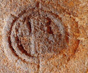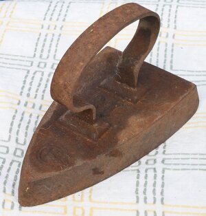 Einfaches, relativ schwerer Flacheisen mit 2,5 cm dickem Boden. Der Bügel in rheinischer Form ist auf dem Eisen angenietet. Zwischen den beiden Befestigungspunkten des Eisen befindet sich die Zahl "18". An der Spitze des Eisens befindet sich eine Gussmarke mit den Initialen "K W", die wir aber keinem Hersteller zuordnen konnten. Zwischen den Initialen befindet sich ein nicht identifizierbarer Gegenstand.