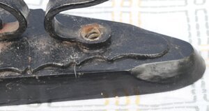 Schön gestaltetes Retro-Bügeleisen zur Nutzung als Deko-Objekt. Das eigentliche Eisen besteht aus Gusseisen. Auf diesem liegt eine eiserne etwa 3mm dicke Platte die das eigentliche Eisen teilweise überdeckt und deren Ränder kunstvoll gestaltet sind. An ihrem rückwärtigem Ende ist eine Aufschrift eingelassen, die leider nicht lesbar ist. Der geschwungene Bügel atmet den Geist eines historischen Flacheisens. Er ist jedoch nicht mit dem eigentliche Eisen verschweist, sondern zusammen mit der auf dem Eisen liegenden Platte mit 2 Sechskantschrauben angeschraubt.