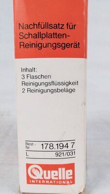 Der Nachfüllsatz für das Schallplattenreinigungsgerät besteht aus, 3 Flaschen je 125 ml Spezielreinigung, die dem Reiunigungsbad zugesetze werden und zwei Ersatz Reinigungsbelägen. Mit diesem Zusatz sollen selbst hatnäckige Verschmutzungen entfernt und die Platten Rillentief gereinigt werden. Der Erfolg soll verblüffend sein. "Volle Klangreinheit von Ton uns Sprache sind wieder herfestellt" so verspricht es der Text auf der Verpackung.