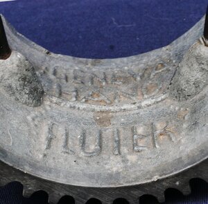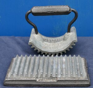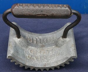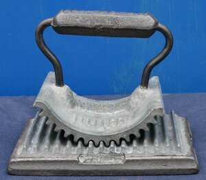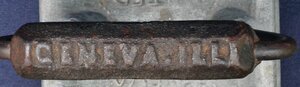"Geneva hand fluter", Zweiteiliges Bügeleisen zum Bügeln von Plisseefalten. Der obere Teil ist eine Art Wippe an der unten Rippen angebracht sind und oben ein Bügel befestigt ist. Der untere Teil ist ist flach und hat oben Rippen. Geneva bezieht sich nicht auf die Stadt der Schweiz, sondern auf Geneva (Illinois). In zeitgenössischen Nachschlagewerken wird Charles A. Sterling aus New York, NY, der am 21. August 1866 das US-Patent Nr. 57.403 (siehe Link) für seine "improvement in fluting-machines" erhielt, als Erfinder des "Geneva Hand Fluter" genannt. In den in den 1870er Jahren veröffentlichten Illinois-Historien wird jedoch Walter D. Turner (ein Mitarbeiter oder Partner von Howell) als Erfinder genannt.