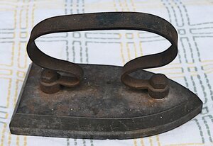 Flacheisen mit Bügel im Rheinischen Stil. Es handelt sich um ein einfaches Flacheisen, das auf der Herdplatte oder an einem Bügeleisenofen erhitzt werden musste. Das Flachbügeleisen gehört zu den massiven Volleisen, die aus Eisen oder Stahl geschmiedet oder gegossen und bereits ab dem 18. Jh. hergestellt wurden. Auffällig ist, dass der vielfach gebogene Bügel nicht auf dem Eisen angeschweißt, sondern auf diesem mit zwei Sechskantschrauben befestigt ist