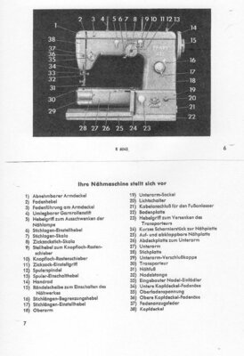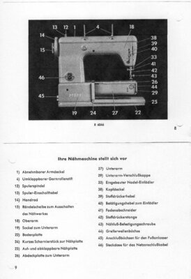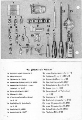 Die Gebrauchsanleitung zur Nähmaschine Pfaff 332 ist im DIN A 6 Format, quer, gehalten und mit vielen Detailfotos bestückt. Auf 104 Seiten wird die Maschine sehr detailliert vorgestellt und der Gebrauch in allen Einzelheiten beschrieben. Dazu gehören auch Tabellen über den Gebrauch unterschiedlicher Nadeln für unterschiedliche Stoffe. Im zweiten Teil sind a) Störungsmöglichkeiten und deren Abhilfe aufgelistet und b) die Anwendung mitgelieferter „Apparate“ zur Erstellung von Ziernähten, Monogramm Stickerei, Kräuselung und vieles mehr. Leider ist der Einband der Anleitung nicht mehr vorhanden, so dass sie provisorisch zusammengehalten wird. Sofern Bedarf an der vollständigen Anleitung besteht, setzen Sie sich mit uns in Verbindung