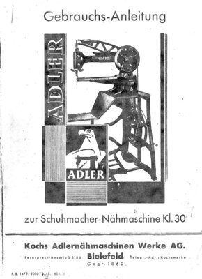 Gebrauchsanleitung für die Ledernähmaschine/Schuhmachernähmaschine "Adler 30". Die Anleitung ist eine Kopie, da das Original nicht mehr vorhanden ist. Auf 20 DIN A5 Seiten wird die Handhabung und Pflege der Maschine im Detail beschrieben. Die Themen reichen vom Riemenauflegen, der Handhabung des Schiffchens, der Fadenspannung, verschiedene Einstellungen der Stichlänge, des Fadenhebels und des Nähfußdrückers. Auch Tipps zum Reinigen, Ölen und Pflegen der Maschine werden aufgezeigt. Im letzten Teil folgt eine Aulistung des mitgelieferten Zubehörs.