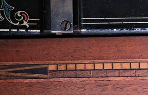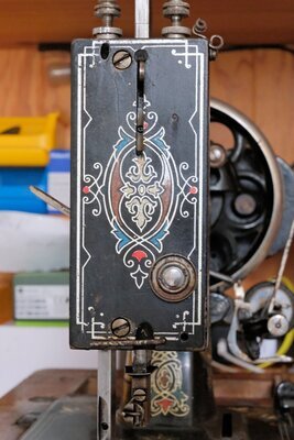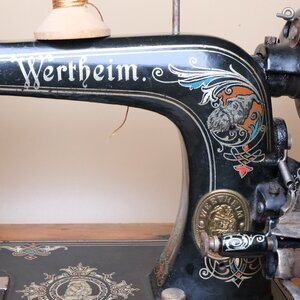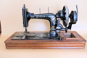 Eine gut erhaltene Haushaltsnähmaschine der Firma Wertheim. Als Tischgerät, mit Handkurbelantrieb wurde sie 1905 unter der Produktionsnummer S6-846756 in Frankfurt hergestellt. Montiert ist sie auf einem Holzunterbau (52 x 25 cm), der auch als Arbeitstisch dient. An seiner Vordersete ist, als Intarsien Arbeit, ein cm/inch Maß eingearbeitet. Die Grundlackierung der Maschine ist schwarz mit vielen gold- und bunten Ornamenten. Das Firmanlogo –ein sitzender Zwerg mit Zipfelmütze- ist mehrmals passend in das Dekor eingearbeitet. Auf dem Maschinenarm steht -ebenfalls von Ornamenten eingerahmt- der Firmenname „Wertheim“. Irgendwann ist die Maschine wohl heruntergefallen, wovon die verbogene Handkurbel und der fehlende Porzellangriff zeugt. Technisch gesehen handelt es sich um eine Langschiff Nähmaschine, die für den Geradstich konzipiert wurde. Empfohlen wurde die Verwendung des Nadeltyps 182.