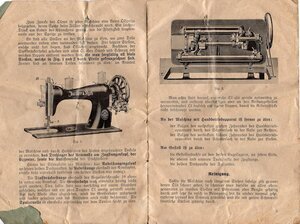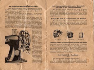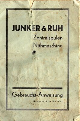 Die im DIN A 5 Format gedruckte Gebrauchsanweisung bezieht sich auf das Modell C von Junker& Ruh aus Karlsruhe. Auf 18 Seiten wird die Maschine sehr detailliert vorgestellt und der Gebrauch in allen Einzelheiten beschrieben. Es beginnt mit dem gleichmäßigen Gebrauch des Fußantriebs, dem Ölen und Reinhalten der Maschine, dem korrekten Einsetzen der Spule bis hin zum Einsetzen der Nadel. Im zweiten Teil sind Störungsmöglichkeiten aufgelistet und deren Abhilfe beschrieben, der Gebrauch von mitgelieferter „Apparaten“ wie dem Spiralsäumer, dem Kapper oder dem verstellbaren schmalen Kantenfuß. Auf der letzten Seite findet sich noch eine Garn und Nadeltabelle ( System 705) sowie eine Auflistung der mitgelieferten Teile. Auf dem hintren Umschlag hat der ehemalige Besitzer die Maße von "Therese" notiert.