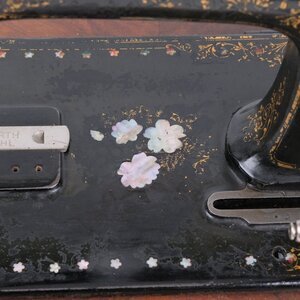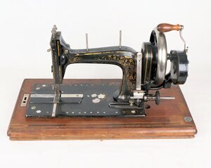 Die Langschiffchen-Nähmaschine des Herstellers Bernd und Brune, Berlin, wurde ca. 1900 unter der Nummer 6843 hergestellt. Es ist ein tragbares Tischmodell mit hölzernem Sockel und Haube. Beids sind mit Intarsien Arbeiten verziert. Der Antrieb erfolgte über eine Handkurbel und fand vorwiegend in privaten Haushalten Verwendung. Dieser Modelltyp konnte auch in ein Untergestell eingebaut werden. Lediglich die Handkurbel musste dafür entfernt und der Antriebsriemen aufgelegt werden. Wie alle Maschinen aus dieser Zeit hat sie eine schwarze Grundfarbe, die mit goldfarbenen Ornamenten und stilisierten Blumen reichlich verziert ist. In die Bodenplatte sind mehrere Perlmutteinlagen eingearbeitet. Die Bodenplatte ist ohne Rostansatz, die Mechanik, samt Langschiffchen, leise und leichtgängig. Weder Nadel- noch Drückerstange sind durch verharztes Öl verunreinigt. Auf der Nadelplatte ist in Großbuchstaben der Name „ BARTH SUHL“ eingraviert. Dabei handelt es sich um die Namensangabe des verkaufenden Händlers in Suhl. Es wäre Interessant zu wissen, auf welchen verschlungenen Pfaden, die Maschine seit 1900 von Suhl aus zurückgelegt hat, bis sie, von einer Trierer Familie, unserem Museum geschenkt wurde.