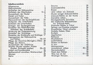Die Gebrauchsanweisung der Automatik-Koffernähmaschine Adlerette 300 hat insgesamt 54 Seiten im DIN A 6 Format. Der Umschlag, in grellen Rot, besteht aus einer leichten Pappe, die einzelnen Seiten aus glänzendem Papier. Der Druck ist s/w. In der Anleitung sind 96 Abbildungen enthalten die, ergänzend zum Text, das Kennenlernen der Maschine erleichtern. Darüber hinaus bekommt der Leser Informationen über die Pflege der Maschine und des Motors. Aber auch die vielen Anwendungsbereiche werden detailliert beschrieben. z.B. das Muster stopfen. Wattierarbeiten, Säumen, Knopflöcher, Zweinadelnähte oder der Gebrauch aller mitgelieferten Nähschablonen. Im letzten Teil geht es um Hilfestellung bei auftretenden Problemen.