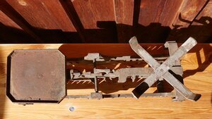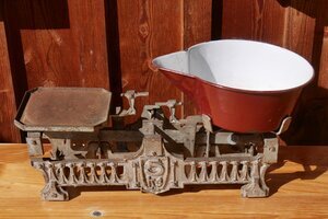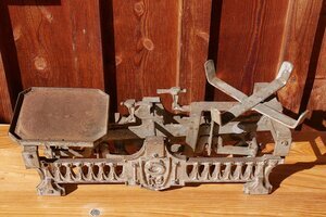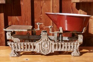 Tafelwaage nach Joseph Béranger, auch Schnabelwaage genannt, im Design des Art déco. In der Mitte steht in einem Wappenschild "5 kg", was die Angabe des Höchstgewichts das diese Waage wiegen konnte bezeichnet. Auf der einen Seite der Waage befindet sich eine Halterung für die original erhaltene Schütte, auf der anderen eine Plattform auf die die Gewichte gestellt werden konnten. In der Mitte der Waage befinden sich zwei gegenüberliegende Vogelköpfe, welche an der Halterung der Waagschalen befestigt sind und bei gleicher Schnabelhöhe die Nullstellung (Gleichgewicht) der Waage anzeigen können. Eine Tafelwaage unterscheidet sich von einer einfachen Balkenwaage durch die Gestänge im Inneren das bewirkt, dass das Moment am Waagebalken von der Position der Gewichte auf der Schale unabhängig ist. Auch werden Schrägstellung als auch Standortbewegungen bei der Béranger-Waage besser kompensiert, was die Nutzungsmöglichkeiten der Tafelwaage wesentlich erweitert. Am rechten Arm der Waage befindet sich ein Eichstempel mit geschweiftem Band und der Inschrift D.R. (für Deutsches Reich). Mit den beiden Ordnungszahlen war das Stempelzeichen der Eichbehörden. Der Eichstempel diente nicht zur Kalibrierung der Waage. Die "11" oberhalb des geschweiften Bandes steht für den zuständigen Eichaufsichtsbezirk in diesem Fall "Köln", zu dem auch die nördlichen Teile des heutigen Rheinland-Pfalz gehörten. Die "12" darunter bezeichnet das Eichamt (ehemals Aichstelle) in Mettmann. Die "22" in dem Schild, früher als Jahreszeichen für die innerstaatliche Eichung bezeichnet, gibt Auskunft über das Ende der Eichfrist der Waage. Die Eichfrist der abgebildeten Waage endete somit mit Ablauf des 31.12.1922. Berücksichtigt man die zweijährige Frist, so muss die Waage spätestens 1920 hergestellt worden sein und wurde nach 1922 nicht mehr im Geschäftlichen benutzt. Sehr ähnliche Waagen gibt es auch mit anderer Gewichtsobergrenzenbzeichnung, meist 10 kg. Wir bedanken uns beim Landesamt für Mess- und Eichwesen Rheinland-Pfalz für die Informationen zum Eichwesen.