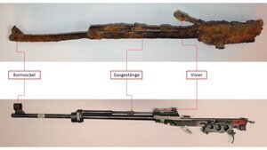 Die Reste des G-43 wurden in der Nähe des Ehrenfriedhofs in Bad Bodendorf (bei 50°33'10'' N; 7°13'34'' E) beim Pflügen aus der Erde gehoben. Das Gewehr 43 ist ein aufschießender Gasdrucklader mit Stützklappenverschluss im Kaliber 7,92 × 57 mm der Deutschen Wehrmacht im 2. Weltkrieg und wurde ab 1943 bis Kriegsende wurden 450.000 Stück produziert. Das Kastenmagazin fasst zehn Schuss, es kann gewechselt oder bei geöffnetem Verschluss mittels Ladestreifen gefüllt werden. Die Reste der Waffe sind stark verbogen und verrostet. Es sind noch Holzreste des Schaftes vorhanden. Noch sehr gut zu erkennen und noch im guten Zustand ist der Kornsockel, das Gasgestänge und das Klappvisier. Vermutlich wurde die Waffe durch verbiegen unbrauchbar gemacht.