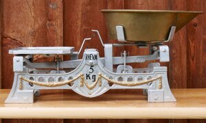 Tafelwaage nach Joseph Béranger im spätklassizistischem Design mit Girlanden an Vorder- und Rückseite. In der Mitte steht der Schriftzug "RHEVA" und darunter "5 kg", was die Angabe des Höchstgewichts das diese Waage wiegen konnte bezeichnet. Statt - dem Produktiosfehler RHEVA - müsste hier (wie z.B. auf der sehr sehr ähnlichen Waage im Heimatmuseum Qierscheid) als Firmenlogo RHEWA für "RHEinischen WAagenfabrik, Mettmann - seit 1904 ursprünglich Rheinische Waagenfabrik A. Freudewald" stehen. Rechts befindet sich eine Halterung für die original erhaltene Schütte, links eine Plattform, auf die die Gewichte gestellt werden können. Von beiden Seiten führen Zeiger in die Mitte. Zur Gewichtsbestimmung müssen diese auf gleicher Höhe sein. Eine Tafelwaage unterscheidet sich von einer einfachen Balkenwaage durch das Gestänge im Inneren. Dieses bewirkt, dass das Moment am Waagebalken von der Position der Gewichte auf der Schale unabhängig ist. Auch werden Schrägstellung als auch Standortbewegungen bei der Béranger-Waage besser kompensiert, was die Nutzungsmöglichkeiten der Tafelwaage wesentlich erweitert. In der Mitte steht in einem Wappenschild "5 kg", was die Angabe des Höchstgewichts das diese Waage wiegen konnte bezeichnet. Rechts befindet sich eine Halterung für die original erhaltene Schütte, links eine Plattform auf die die Gewichte gestellt werden konnten. Von beiden führen Zeiger in das Innere. Zur Gewichtsbestimmung mussten diese auf gleicher Höhe sein. Am rechten Arm des Waagbalkens befindet sich ein Eichstempel mit geschweiftem Band und der Inschrift D.R. (für Deutsches Reich). Mit den beiden Ordnungszahlen war das Stempelzeichen der Eichbehörden. Die "11" oberhalb des geschweiften Bandes steht für den zuständigen Eichaufsichtsbezirk in diesem Fall "Köln", zu dem auch die nördlichen Teile des heutigen Rheinland-Pfalz gehörten. Die "12" darunter bezeichnet das Eichamt (ehemals Aichstelle) in Mettmann. Die Zahlen "23," "27" und "29", früher als Jahreszeichen für die innerstaatliche Eichung bezeichnet, geben Auskunft über das Ende der Eichfrist der Waage. Die Waage wurde also drei mal überprüft und die letzte Eichfrist der abgebildeten Waage endete somit mit Ablauf des 31.12.1929. Danach wurde sie vermutlich nicht mehr im geschäftlichen verwendet. Möglicherweise ist der aktuell auf der Waage befindliche Eichstempel nicht der erste, da die Waage vom Dekor her etwas früher entstanden sein dürfte. Sehr ähnliche Waagen gibt es auch mit anderer Gewichtsobergrenzenbzeichnung, meist 10 kg. Wir bedanken uns beim Landesamt für Mess- und Eichwesen Rheinland-Pfalz für die Informationen zum Eichwesen.