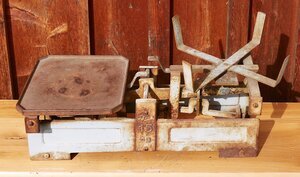 Tafelwaage nach Joseph Béranger im Design des Art déco. In der Mitte steht in Schreibschrift "Rhewg", darunter "15 kg", was die Angabe des Höchstgewichts, das diese Waage wiegen konnte, bezeichnet. Rechts befindet sich eine Halterung für die original erhaltene Schütte, links eine Plattform auf die die Gewichte gestellt werden konnten. Von beiden führen Zeiger in die Mitte. Zur Gewichtsbestimmung müssen diese auf gleicher Höhe sein. Eine Tafelwaage unterscheidet sich von einer einfachen Balkenwaage durch die Gestänge im Inneren. Diese bewirken, dass das Moment am Waagebalken von der Position der Gewichte auf der Schale unabhängig ist. Auch werden Schrägstellung als auch Standortbewegungen bei der Béranger-Waage besser kompensiert, was die Nutzungsmöglichkeiten der Tafelwaage wesentlich erweitert. Am rechten Arm der Waage befindet sich ein Eichstempel mit geschweiftem Band und der Inschrift D.R. (für Deutsches Reich - diese Bezeichnung wurde erst 1975 auf D umgestellt). Mit den beiden Ordnungszahlen war das Stempelzeichen der Eichbehörden. Der Eichstempel diente nicht zur Kalibrierung der Waage. Die "11" oberhalb des geschweiften Bandes steht für den zuständigen Eichaufsichtsbezirk in diesem Fall "Köln", zu dem auch die nördlichen Teile des heutigen Rheinland-Pfalz gehörten. Die "12" darunter bezeichnet das Eichamt (ehemals Aichstelle) in Mettmann. Die "60" in dem Schild, früher als Jahreszeichen für die innerstaatliche Eichung bezeichnet, gibt Auskunft über das Ende der Eichfrist der Waage. Die Eichfrist der abgebildeten Waage endete somit mit Ablauf des 31.12.1960. Berücksichtigt man die zweijährige Frist, so muss die Waage spätestens 1958 hergestellt worden sein und wurde nach 1960 nicht mehr im geschäftlichen benutzt. Da diese Plakette wohl kaum die erste war, die auf dieser Waage angebracht war, kann die Waage auch schon viel früher hergestellt worden sein. Sehr ähnliche Waagen gibt es auch mit anderer Gewichtsobergrenzenbzeichnung, meist 10 kg oder 5 kg. Wir bedanken uns beim Landesamt für Mess- und Eichwesen Rheinland-Pfalz für die Informationen zum Eichwesen.