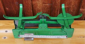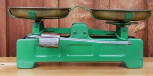 Grüne Tafelwaage nach dem System Roberval. Vereinfacht gesagt, wird hier eine Balkenwaage durch einen zweiten Balken unterhalb des ersten Balkens ergänzt. Dieser bewirkt, dass das Moment am Waagebalken von der Position der Gewichte auf der Schale unabhängig ist. Zusätzlich besitzt die Waage eine Schiene mit einem Laufgewicht, welche mit zwei Halterungen am Waagebalken angebracht ist. Mit ihr wird der Wiegevorgang nicht nur schneller sondern auch genauer. Das virtuelle Zusatzgewicht des Laufgewichts (an der jeweiligen Stelle der Schiene) wird zur Summe der Gewichte in der Gewichtsschale addiert. Damit kann das Gewicht des zu wiegenden Produkts schnell auf einer bis 500g reichenden Skala bis auf 5g genau bestimmt werden.