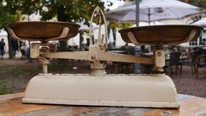 Weisse Tafelwaage nach dem System Roberval. Vereinfacht gesagt, wird hier eine Balkenwaage durch einen zweiten Balken unterhalb des ersten Balkens ergänzt. Dieser bewirkt, dass das Moment am Waagebalken von der genauen Position der Gewichte auf der Schale unabhängig ist. Oben auf dem Gehäuse steht "5 KG" was die maximale Beladung bezeichnet und daneben "D.R.G.M." für Deutsches Reich Gebrauchsmuster. Leider sind die alle Unterlagen zu Gebrauchsmustern im 2. Weltkrieg verloren gegangen. DIe Waage besitzt zwei Schalen aus Messing. Am Mittelgelenk ist ein nach oben gerichteter Zeiger angeschraubt. Wenn er senkrecht nach oben zeigt ist das Gewicht in beiden Waagschalen identisch. Um das Ablesen zu erleichtern umgibt ein fixer Metallbogen mit einer Markierung oben in der Mitte den beweglichen Zeiger.