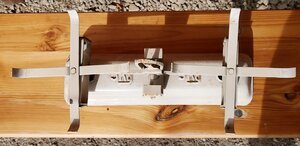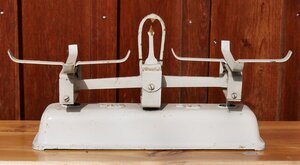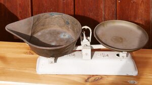 Weiße Tafelwaage (Zeigerwaage) nach dem System Roberval. Vereinfacht gesagt, wird hier eine Balkenwaage durch einen zweiten Balken unterhalb des ersten Balkens ergänzt. Dieser bewirkt, dass das Moment am Waagebalken von der genauen Position der Gewichte auf der Schale unabhängig ist. Oben auf dem Gehäuse steht zwei mal "5 KG" was die maximale Beladung bezeichnet. DIe Waage besitzt eine Schütte und eine Schale aus Messing. Am Mittelgelenk ist ein nach oben gerichteter Zeiger angeschraubt. Wenn er senkrecht nach oben zeigt ist das Gewicht in beiden Waagschalen identisch. Um das Ablesen zu erleichtern umgibt ein fixer Metallbogen mit einer Markierung oben in der Mitte den beweglichen Zeiger.