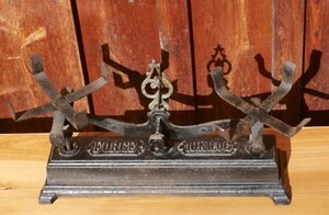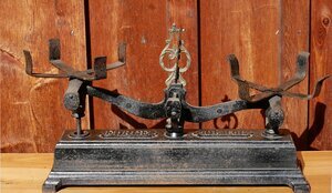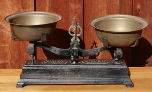 Schwarze Tafelwaage nach dem System Roberval. Vereinfacht gesagt, wird hier eine Balkenwaage durch einen zweiten Balken unterhalb des ersten Balkens ergänzt. Dieser bewirkt, dass das Moment am Waagebalken von der genauen Position der Gewichte auf der Schale unabhängig ist. Das System Roberval ist dabei deutlich älter und einfacher, als das später verbreitetere System Béranger. Oben auf dem Gehäuse steht auf je einer mit Schrauben befestigte Plakette links "FORGES" und rechts "10KILOG " was die maximale Beladung bezeichnet. DIe Waage besitzt zwei Schüsseln aus Messing. Am Mittelgelenk ist ein nach oben gerichteter Zeiger angeschraubt. Wenn er senkrecht nach oben zeigt ist das Gewicht in beiden Waagschalen identisch. Um das Ablesen zu erleichtern umgibt ein fixes Ornament mit einer Markierung oben in der Mitte den beweglichen Zeiger.