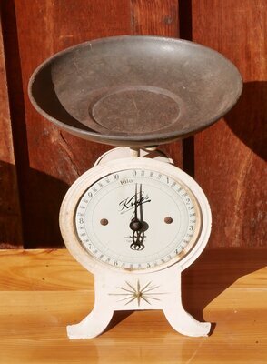 Federwaagen bestimmen ein Gewicht aufgrund der Verformung einer im Inneren der Waage befindliche Feder. Haushaltswaage mit der Aufschrift "Krups" in Zierschrift im oberen Teil und in der horizontalen Mitte des Ziffernblatts. Weiter unten befindet sich das Logo von Krups und die Aufschrift "Fabrik Marke".. Die Waage besteht - von oben nach unten - aus einer runden Kupferschale, einer Halterung in der letztere sicher liegt und der eigentlichen, runden Anzeige mit Zifferblatt und Zeiger. .Die Uhr steht auf 3 Füßen. Zwischen den beiden vorderen Füßen ist eine Blende angebracht, auf der eine stilisierte goldene Sonne zu sehen ist. Etwas innerhalb des runden Rands des Ziffernblatts befindet sich eine Gewichtsskala in Kilo. Hergestellt wurden diese Waagen von etwa 1900 bis etwa 1930.