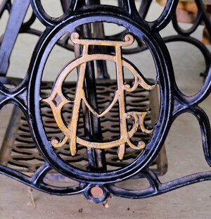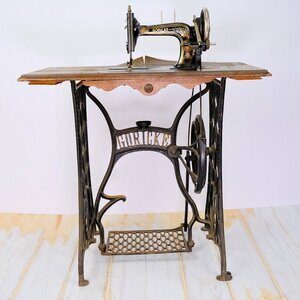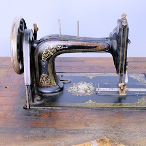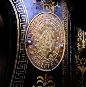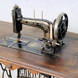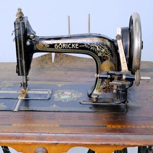 Die Firma August Göricke hat neben Fahrräder auch eine Zeitlang Nähmaschinen hergesellt. Unser Objekt trägt die Herstellungsnummer 141107. Das Produktionsjahr konnten wir nicht ermitteln. Maschine und Grundplatte sind schwarz lackiert und ist mit einem umlaufenden Mäander Muster versehen. Zusätzlich wurde in die Grundplatte, eine Perlmutt-Intarsie eingearbeitet. Ob es sich dabei um echtet Perlmutt handelt konnten wir nicht klären. Das Tischmodell ist nicht versenkbar und leider fehlt die dazugehörige Holzhaube. Der Unterbau ist aus Gusseisen, trägt mittig den Namenszug „GÖRICKE“ und an beiden Seiten das Namenskürzel „AG“ (August Göricke) s. Bild. Der Antrieb erfolgt über einen Tretmechanismus mit Keilriemenantrieb. Das verbaute Langschiffchen steht für zügiges nähen und saubere Nähte. Der Aufspulapparat wird durch eine kleine Drehbewegung mit dem Handrad verbunden und so angetrieben. Die Maschine befindet sich in keinem guten Zustand. Die Mechanik ist stark verharzt und verschmutzt, die Schublade unterhalb des Arbeitstisches und die Abdeckhaube fehlen. Das Furnier der Arbeitsplatte ist beschädigt. Technisch handelt es sich um eine Geradstich Nähmaschine mitLanggschiffchen.