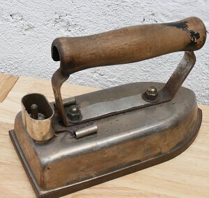 Das Elektrisches Bügeleisen der ist ein Haubeneisen mit Gusseisensohle und einer Haube aus vernickeltem Eisenblech. Der Holzgriff ruht auf mit französischen Griffstützen. Es besitzt als (männliche) Stecker einen zweipoligen, sogenannten Waffel- oder Bügeleisenstecker, wie er für Heißgeräte wie Waffeleisen, Bügeleisen oder Wasserkochern verwendet wurde. Der Anschluss für das Elektrokabel ist als Stecker mit Metallummantelung ausgeführt. Das Bügeleisen konnte ausschließlich mit Wechselstrom mit 200/240 Volt Spannung . Das Bügeleisen besitzt keinen Thermostat. Leider ist das Typenschild nicht mehr vorhanden. Bügeleisen werden seit dem 17. Jahrhundert zum Glätten der Wäsche verwendet. Die ersten Bügeleisen bestanden aus einer Metallplatte und einem bügelartigen aus Eisen. Daher auch der Name. Mit der Elektrifizierung der Haushalte setzten sich Elektrobügeleisen mehr und mehr durch. Die Leistung der Geräte lag bei meistes bei etwa 500 W.