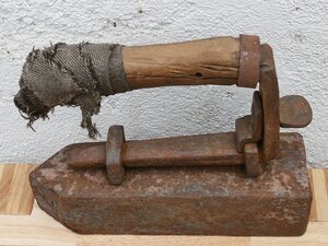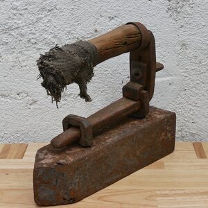 Blockeisen waren sehr schwere Bügeleisen und typische Arbeitsgeräte von Schneidern. Im Gegensatz zum häuslichen Bügeln, das eine typische Frauenarbeit war, wurde diese Bügeleisehn von Männern genutzt. Das Blockeisen ist ein sogenanntes Wechsel-Plättbolzen mit ausklinkbarem Holzgriff. Dieser kann durch zwei Halterungen auf dem Eisen geschoben werden und wird dann mit einer am Stiel des Griffs angebrachten Lasche arretiert. Der Griff konnte dabei abwechselnd auf mehrere Eisen montiert werden um ein kontinuierliches Bügeln zu ermöglichen. Die gerade nicht gebrauchten Eisen werden dabei auf einem Ofen oder im Feuer erhitzt. Keine weiteren Informationen zum Hersteller. Das Eisen und sein Griff sind sehr stark angerostet. Die Spitze des Griffs ist mit einem Lappen umwickelt. Wie der Name schon sagt, bestehen diese Eisen aus einem Block, Eisen oder Stahl geschmiedet bzw. gegossen. Sie haben ein beträchtliches Gewicht von 3-12 kg und wurden vorwiegend von Schneidern ab etwas Mitte des 18. Jahrhunderts bis ins 20. Jahrhundert benutzt. Das in der Glut des Stubenofens erhitzte schwere Eisen konnte mit dem vorher abgenommenen Griff wieder aus dem Feuer herausgezogen werden und wurde dann auf einer Eisenplatte oder auf dem Fußboden abgestellt. Der Nachteil dieses Eisens ist, dass man beim Einführen und Sichern des Griffs an glühend heissem Metall herumfummeln muß, was nicht ganz ungefährlich gewesen sein dürfte da das Eisen selber ist extrem schwer ist.