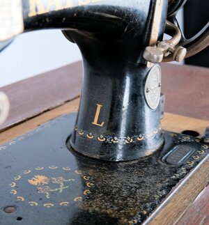 Das Modell „L“ von Kayser wurde in drei Varianten, je nach Wunsch, ausgeliefert. Zur Verfügung standen die Antriebe mit Handkurbel, Tretantrieb oder mit Anbaumotor. Unsere Maschine hat einen Tretantrieb und kann versenkt werden. Die Seriennummer 1.168.396 deutet darauf hin, dass es sich um eine Machine handelt, die nach dem Krieg hergestellt wurde. Das Modell L ist eine Geradstich, Flachbettmaschine mit Schwingschiffchen und Vor- und Rückwärtslauf. Die Mechanik ist robust und ausgereift, so dass die Nähmaschine heute noch läuft. Die Lackierung der Maschine ist schwarz und weitgehend ohne zusätzliche Verzierungen. Dafür steht der Name KAYSER, prominent auf beiden Seiten des Maschinenarms. Der Arbeitstisch ist aus Holz und einfach furniert. Darunter sind zwei Schubladen zur Aufnahme diverser Nähutensilien angebracht. Bei versenkter Maschine wird die Öffnung durch einen Deckel verschlossen, der leider nicht mehr vorhanden ist. Das Gusseiserne Untergestell fällt durch seine schwungvollen Formen auf und die trägt gleich dreimal mit Namen „KAYSER“.