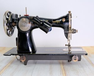 Die Nähmaschine trägt auf der Armoberseite den Hinweis „Fabrication Francaise“. Sie wurde für den französischen Markt produziert und verkauft. Das Modell 15 ist eine sehr erfolgreiche Modellreihe und wurde über viele Jahrzehnte gebaut. Die Herstellernummer SA 382579 kann dem Baujahr 1951 zugeordnet werden. Alle Maschinen die 1951 hergestellt wurden tragen ein blau umrandetes, auf genietetes Firmenlogo, das für "100 Jahre Singer 1851-1951" ausgegeben wurde. Die Maschine kam ohne Unterteil in unseren Besitz. Ursprünglich war sie versenkbar in einen Tisch bzw. Nähmaschinenschrank eingebaut. Der Antrieb erfolgte mittels Fußpedal und Lederriemen. Der Anbau eines E Motors ist bereits vorgesehen. Der Aufspuler wird über das Handrad angetrieben. Als Zubehör wurde damals das Singer Nähmaschinenlicht angeboten, das bei unserem Objekt vorhanden ist. Technisch handelt es sich um eine Geradstich-Flachbett-Nähmaschine zum Einbau mit Fußantrieb und Zentralspule.