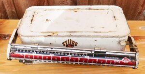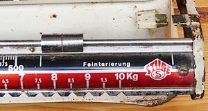 Stube Laufgewichtswaage Laufgewichtswaagen sind asymmetrische Balkenwaagen. Dieses seit der römischen Schnellwaage bekannte Prinzip wurde in den Laufgewichts-Brückenwaagen weiterentwickelt. Mittels Verschieben der Gewichte auf der mit einer Messskala ausgestatteten Brücke kann das Gewicht des Wiegeguts ermittelt werden. Die Waage ist dann im Gleichgewicht, wenn der rechts an der Brücke angebrachte Marker auf gleicher Höhe wie der an der Waage fest angebrachte Marker ist. Die Waage ist bis 10,5 kg belastbar. Die Waage ist größtenteils weiß lackiert und steht auf 4 Füßchen. Die Schale, die Brücke und die Gewichte sind verchromt. An der Vorderseite der Waage und rechts an der Brücke ist das Logo des Herstellers angebracht. Die Gewichtsskalen sind in weißer Schrift angebracht. Bei der Grobgewichtsskala auf rotem Grund, bei der Feineinstellungsskala auf schwarzem Grund. Die Gewichtsmessung erfolgt folgendermaßen: Die Schale wird mit dem Wiegegut gefüllt und drückt auf die unterhalb innerhalb des Gehäuses der Waage befindlichen Mechanik. Die Brücke klappt links nach unten und rechts nach oben. Das untere (große) Gewicht dient nun der "Grobeinstellung". Im Verlauf des Wiegens wird dieses so weit nach rechts verschoben, dass die Leiste mit der Skala gerade nicht nach rechts kippt. Das Gewicht lässt man nun bei der Aussparung der letzten davorliegenden Groß-Maßeinheit einrasten. Auf einer Schiene darüber befinden sich zwei weitere kleinere Gewichte. Das linke Gewicht dient beim Wiegevorgang zur bis auf 5 g genauen Feineinstellung. Das rechte Gewicht dient zur Eleminierung der Tara. D.h. mit diesem wird die Waage in das Gleichgewicht gebracht, wenn die anderen beiden Gewichte auf 0 stehen und auf der Waage ein Behälter steht in den das Wägegut eingefüllt wird, und der nicht mit gewogen werden soll. Die Firma Richard Stube, Herstellerin der Waage wurde 1932 in Gevelsberg gegründet und stellte Baubeschläge, Waagen und Küchenutensilien her. Die bekanntesten Produkte sind wohl die mechanischen Küchenwaagen, wie hier im Bild, die in der vordigitalen Zeit in vielen Haushalten zu finden waren. Teilweise waren die Waagen auch mit einem Aufsatz zum Wiegen von Babys ausgestattet. In den 2000endern stellt die Firma die Produktion ein.